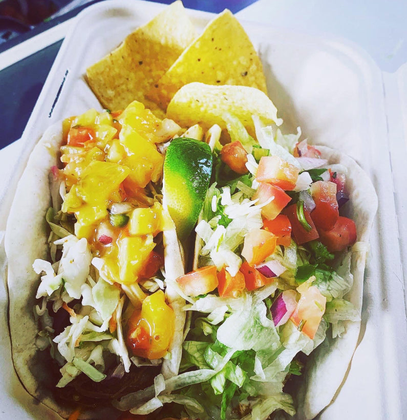 Slow Roasted Pork, Sharp Cheddar Cheese, High Tide Sauce (Carolina Sweet Mustard Sauce) Pickled Red Onions, Turbo Slaw, and Mango Pineapple Pico.